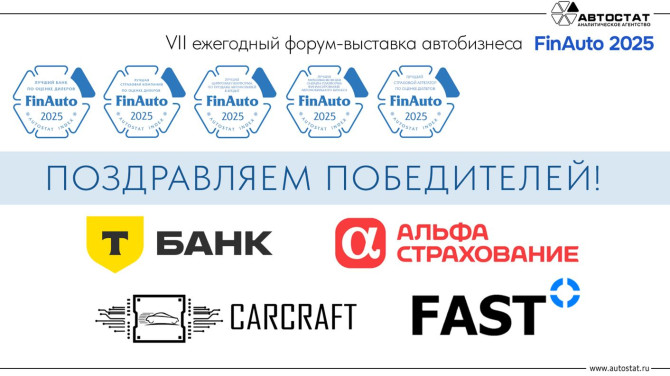 В ходе форума автобизнеса «FinAuto – 2025. Финансовые инструменты автобизнеса», организованного агентством «АВТОСТАТ», прошло награждение победителей одноименной Премии. В результате этого стали известны лучшие в различных номинациях, а именно: автокредитные банки-партнеры, страховые компании, мультибанковская онлайн-платформа финансирования автобизнеса, цифровая платформа по продажам автомобилей в кредит и страховой агрегатор.
