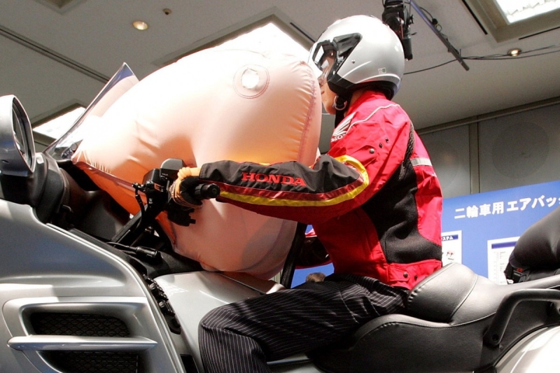 МОТОГОНКИ.РУ, 16 апреля 2025 — До сего момента только один мотоцикл в истории оснащен системой Airbag — Honda Gold Wing Tour, у которого подушка безопасности водителя расположена прямо перед ним, в отсеке вместо бардачка для перчаток. Система аналогична автомобильной, то есть газогенератором является пиропатрон, а подушка выстреливается в пространство между рулевой колонкой и водителем, препятствуя кувырку через руль (или через автомобиль, в который этот мотоцикл врезается).